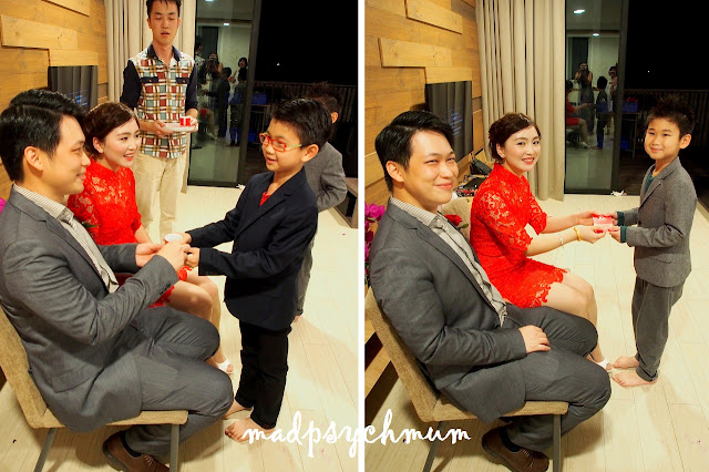 | Nephew C and Nephew D serving tea to their new third aunt (san shen) |