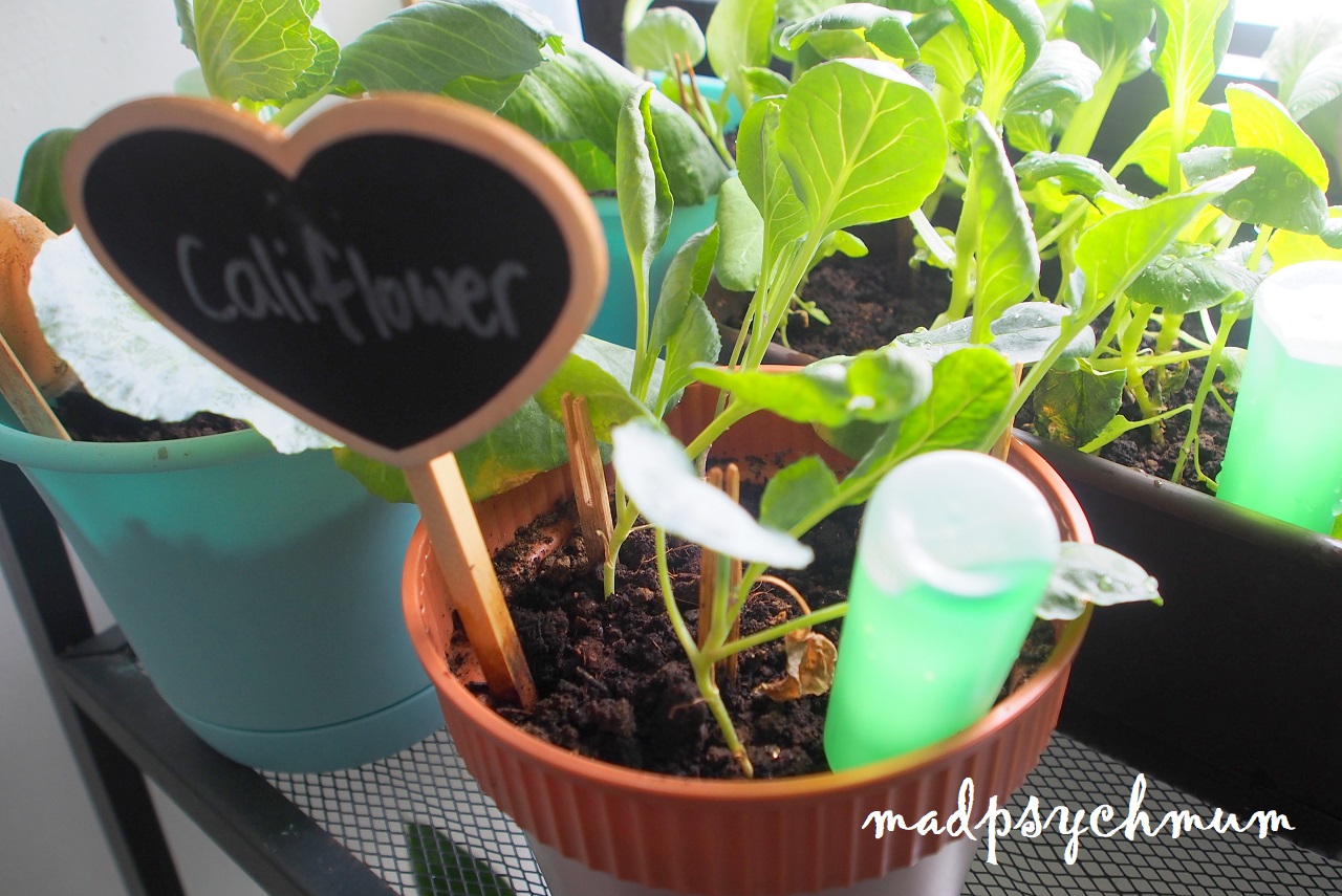 Like the cabbage, califlower also requires space to grow, though less space than the cabbage. We've not had any luck harvesting yet, mainly because we did not place it at a prominent spot with more sunlight. It's not doing too badly though.